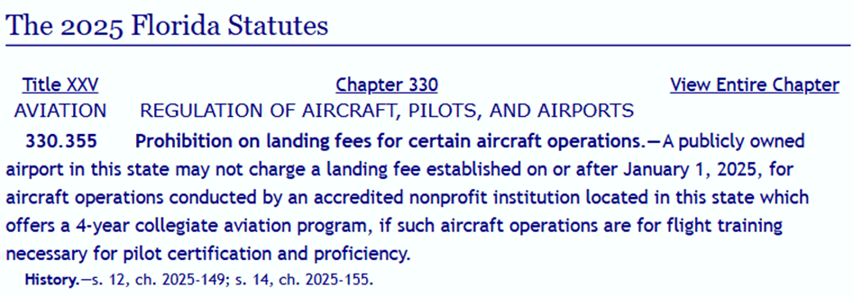FMI: https://avweb.com/aviation-news/piper-seminole-dx-receives-first-us-order/ - Landing fees banned in Florida for some stakeholders. Did you know about Florida Statutes Title XXV (Aviation), Chapter 330 (Regulation of Aircraft, Pilots, and Airports), Section 330.355? Also known as FS 330.355. It is nicknamed the “Embry-Riddle Law” for good reason. Here it is: