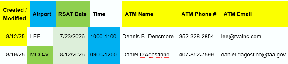 FMI: drs.faa.gov, the FAA’s Dynamic Regulatory System - Runway Safety Action Team (RSAT) Calendar (NPP05). FY-26 RSAT calendar is developing, and will fill up quickly in the next several months, and once the shutdown is over. Here’s what we have as of 18 Sep on upcoming RSAT’s within the Orlando District.
